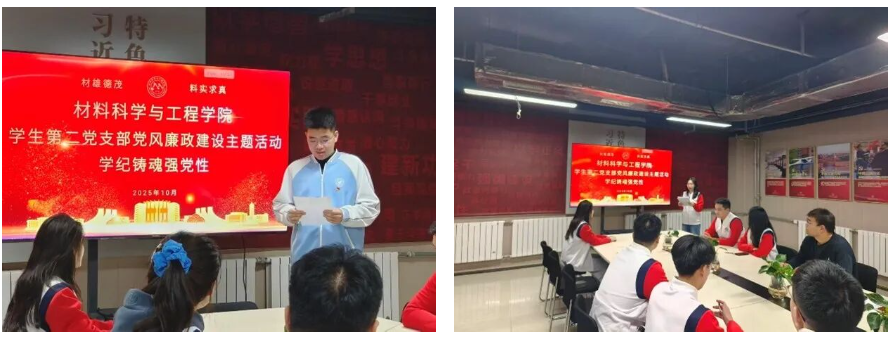 为深入贯彻落实学校《关于开展2025年党风廉政建设宣传教育月活动的通知》要求,强化党员理想信念教育和纪律规矩意识,10月24日下午,材料科学与工程学院学生第二党支部在学校一站式学生服务社区“信仰加油站”,开展党风廉政建设宣传教育活动。本次活动由党支部书记郑志伟主持,支部全体党员参会。
